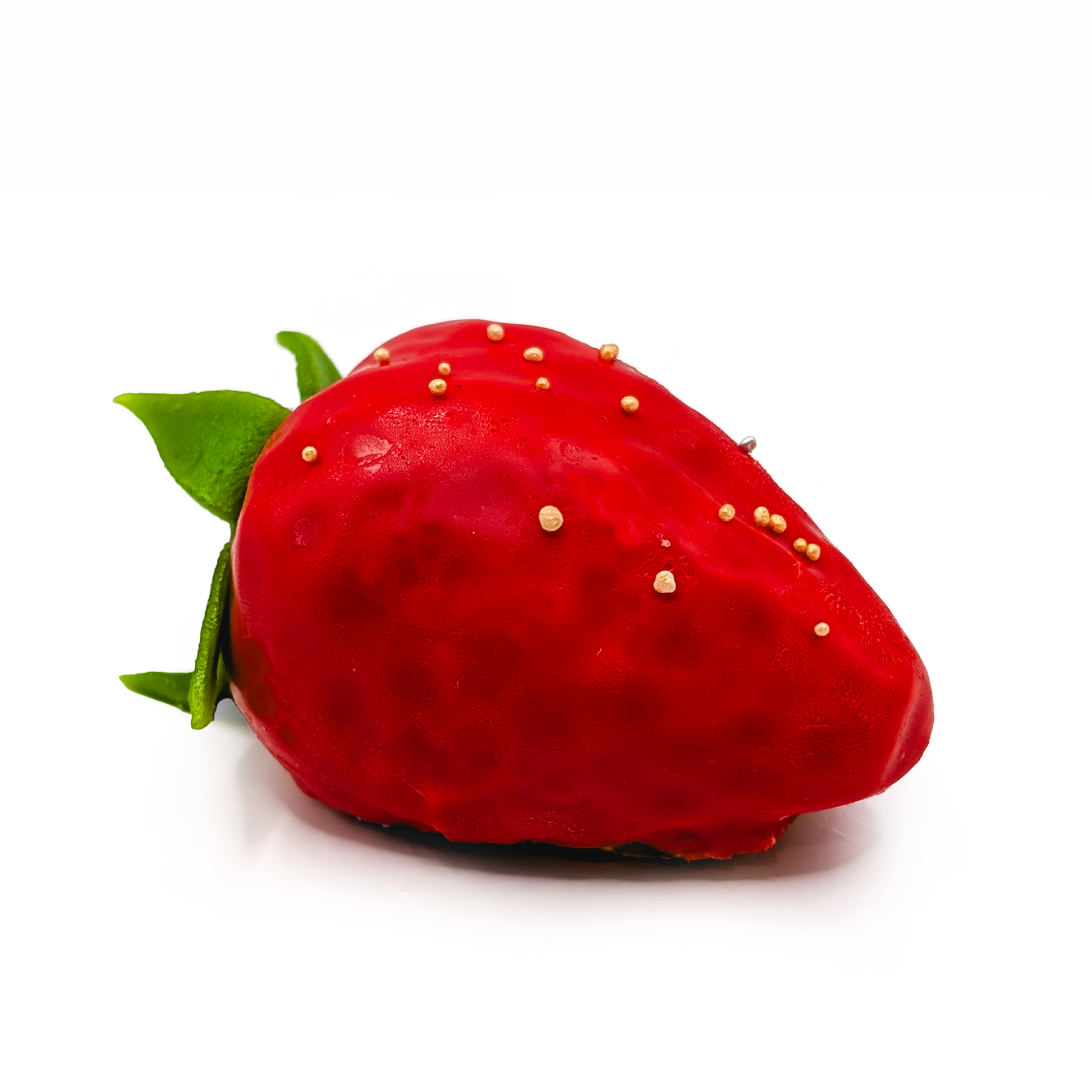 Notre trompe-l'oeil Fraise est composé d'une compotée de fraise, d'une ganache montée à la fraise basilic et rhubarbe et d'un biscuit coco.